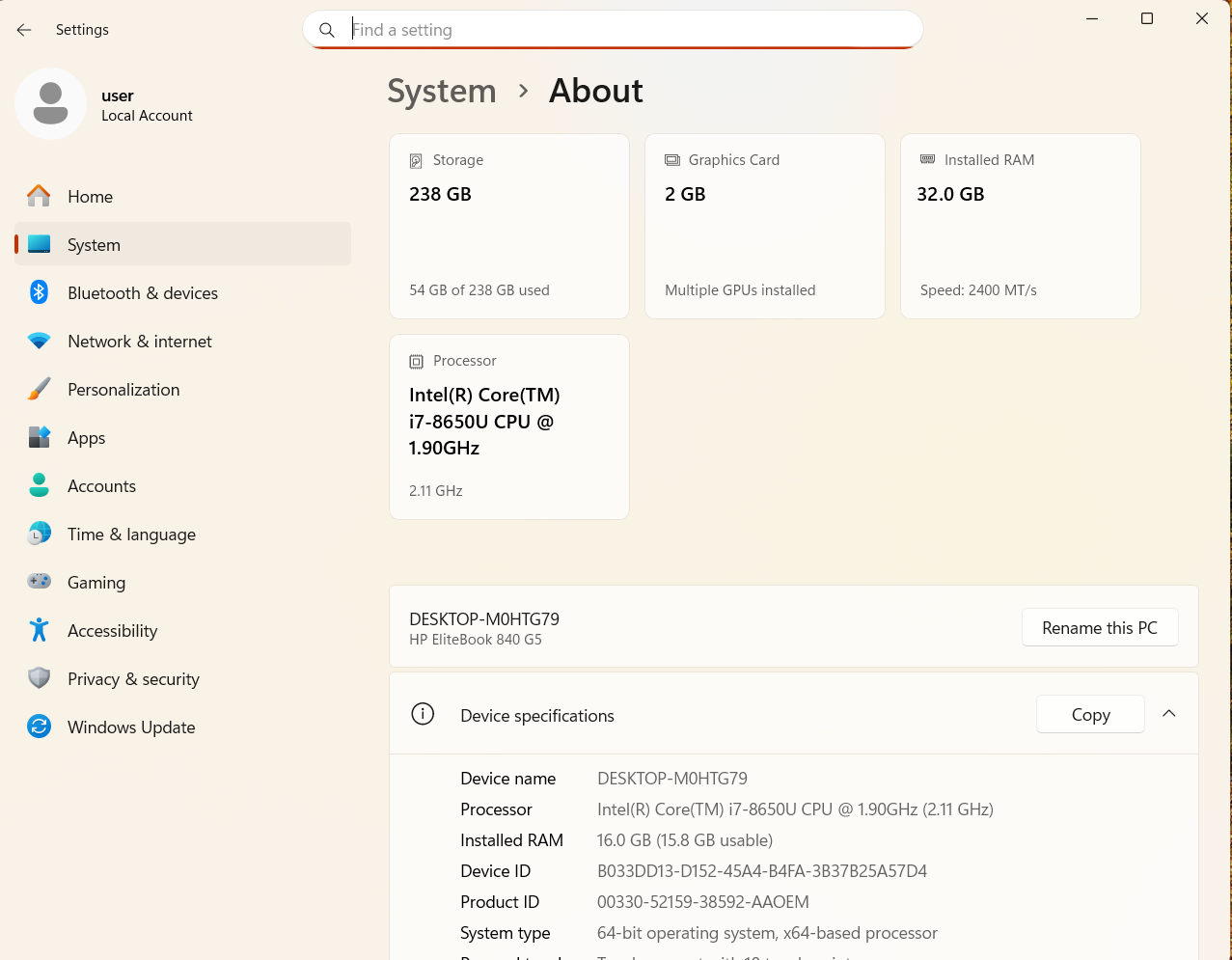 - Processor: Intel Core i7-8650U @ 1.9Ghz