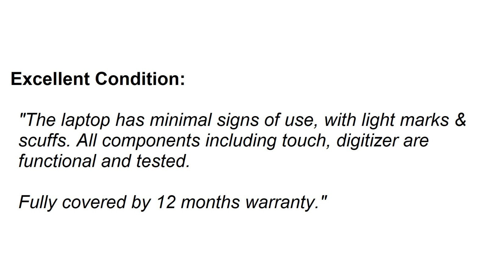 "The laptop has minimal signs of use, with light marks & scuffs. All components including touch, digitizer are functional and tested. Fully covered by 12 months warranty."