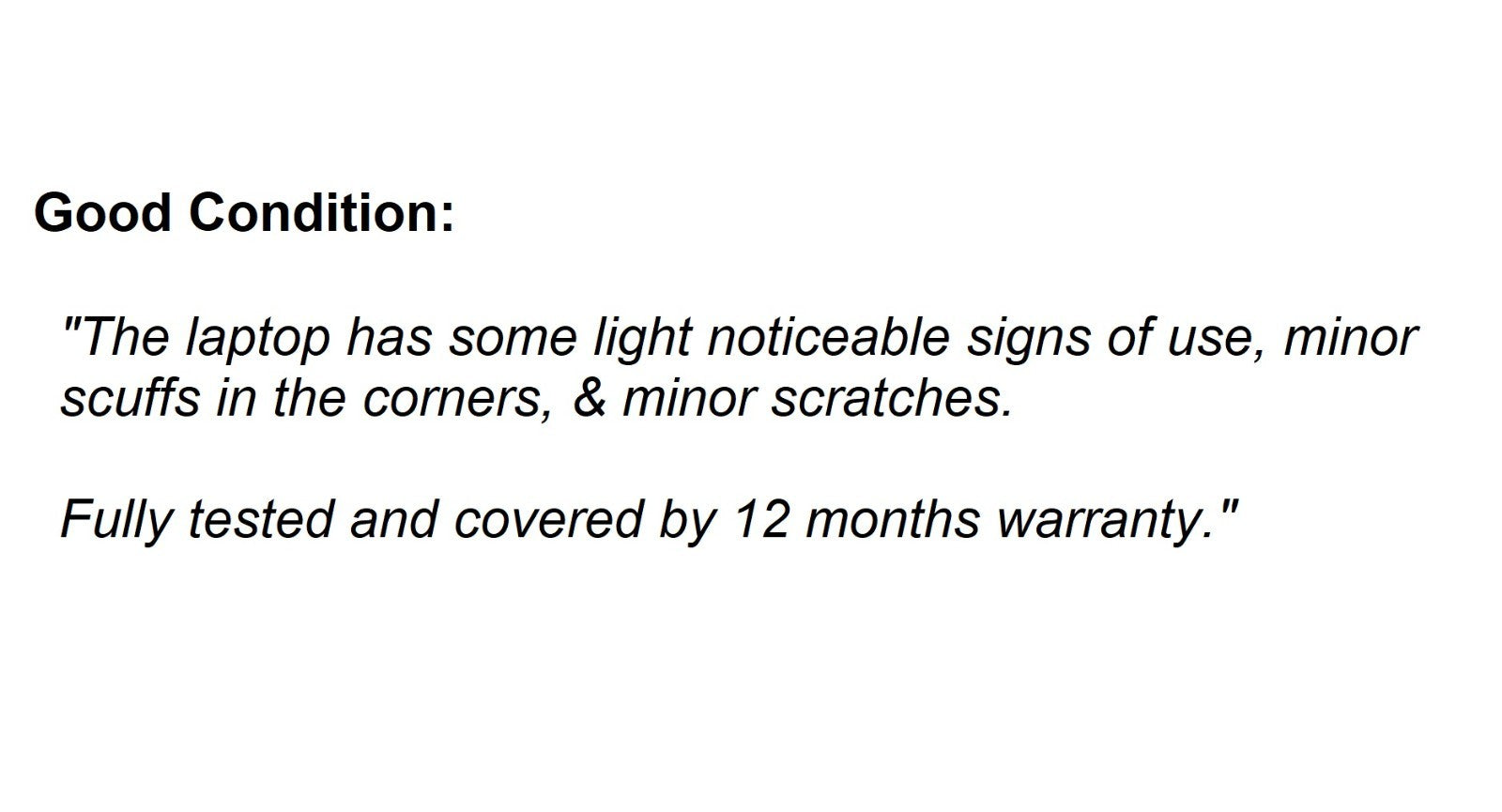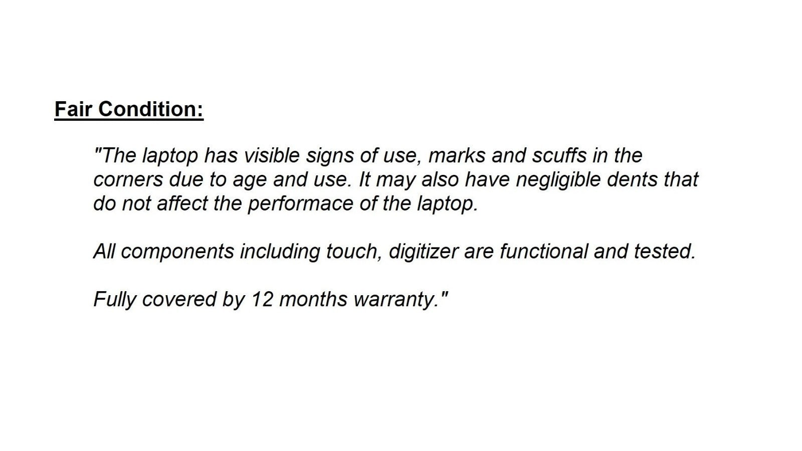 "The laptop has visible signs of use, marks and scuffs in the corners. It may also have negligible dents that do not affect the performance of the laptop. All components including touch, digitizer are functional and tested. Fully covered by 12 months warranty."